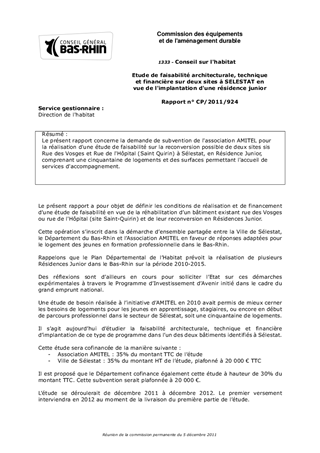 Le présent rapport concerne la demande de subvention de l'association AMITEL pour la réalisation d'une étude de faisabilité sur la reconversion possible de deux sites sis Rue des Vosges et Rue de l'Hôpital (Saint Quirin) à Sélestat, en Résidence Junior, comprenant une cinquantaine de logements et des surfaces permettant l'accueil de services d'accompagnement.