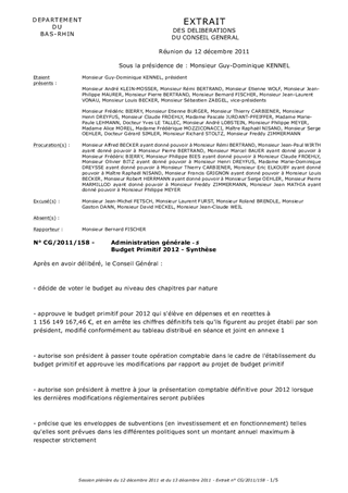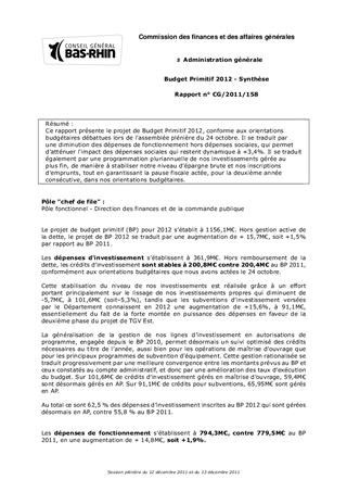 Ce rapport présente le projet de Budget Primitif 2012, conforme aux orientations budgétaires débattues lors de lassemblée plénière du 24 octobre. Il se traduit par une diminution des dépenses de fonctionnement hors dépenses sociales, qui permet datténuer l'impact des dépenses sociales qui restent dynamique à +3,4%. Il se traduit également par une programmation pluriannuelle de nos investissements gérée au plus fin, de manière à stabiliser notre niveau dépargne brute et nos inscriptions demprunts, tout en garantissant la pause fiscale actée, pour la deuxième année consécutive, dans nos orientations budgétaires.