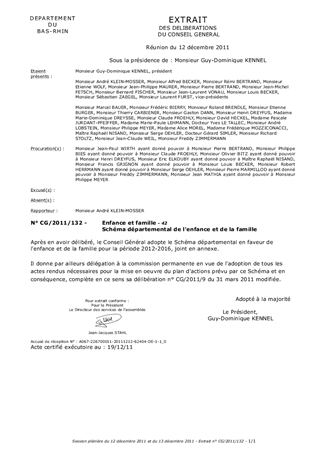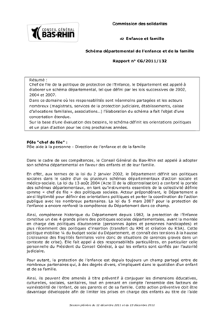 Chef de file de la politique de protection de lEnfance, le Département est appelé à élaborer un schéma départemental, tel que défini par les lois successives de 2002, 2004 et 2007. Dans ce domaine où les responsabilités sont néanmoins partagées et les acteurs nombreux (magistrats, services de la protection judiciaire, établissements, caisse dallocations familiales, associations ) lélaboration du schéma a fait lobjet dune concertation étendue. Sur la base dune évaluation des besoins, le schéma définit les orientations politiques et un plan daction pour les cinq prochaines années.