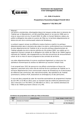 Les actions volontaristes, développées depuis de longues années dans le domaine de lhabitat par le Département, ont été amplifiées depuis le 1er janvier 2006 avec la mise en oeuvre de la loi du 13 août 2004. En effet, le Conseil Général a obtenu du préfet la délégation des aides à la pierre de l'Etat sur le territoire départemental en dehors de celui de la communauté urbaine de Strasbourg. Le présent rapport retrace les différents modes d'actions relatifs à la politique départementale dans le domaine des aides à la pierre, conformément aux orientations du plan départemental de lhabitat et de la nouvelle politique départementale de lhabitat adoptés lors de la réunion plénière du 26 octobre 2009. Les crédits qui s'y rapportent tiennent compte de la délégation de crédits de l'Etat et de l'ANAH (agence nationale de l'habitat), des engagements au titre des conventions de renouvellement urbain et de la mise en oeuvre progressive des contrats de territoire. Les aides départementales à la pierre constituent également un atout pour les opérateurs économiques du secteur du bâtiment qui soutient l'emploi local. Il est proposé pour 2012 de poursuivre nos efforts volontaristes en faveur du logement, assumant ainsi notre rôle de chef de file de la politique de l'habitat sur le territoire départemental (hors communauté urbaine de Strasbourg) et d'interlocuteur de référence des communes, des intercommunalités, des opérateurs de l'habitat (promoteurs, bailleurs HLM, associations et aménageurs) et des particuliers. Il vous est donc proposé de voter de nouvelles autorisations de programme à hauteur de 16.4 M€ (17,9 M€ en 2011) pour un montant total de crédits de paiements pour 2012 s'élevant à 15 792 994 € (14 300 000 € en 2011). Les recettes attendues de l'Etat et de l'ANAH pourraient s'élever à 4,2 M€.