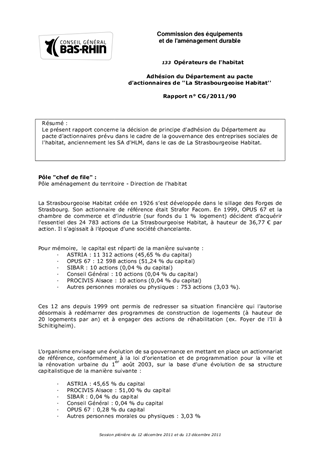 Le présent rapport concerne la décision de principe d'adhésion du Département au pacte d'actionnaires prévu dans le cadre de la gouvernance des entreprises sociales de l'habitat, anciennement les SA d'HLM, dans le cas de La Strasbourgeoise Habitat.