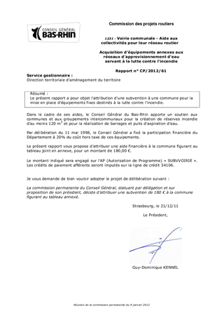 Le présent rapport a pour objet lattribution d'une subvention à une commune pour la mise en place déquipements fixes destinés à la lutte contre lincendie.