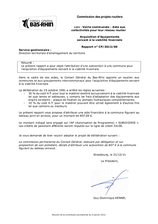 Le présent rapport a pour objet lattribution d'une subvention à une commune pour lacquisition déquipements servant à la viabilité hivernale.