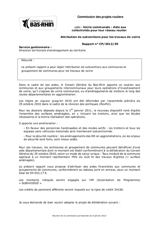 Le présent rapport a pour objet lattribution de subventions aux communes et groupement de communes pour les travaux de voirie