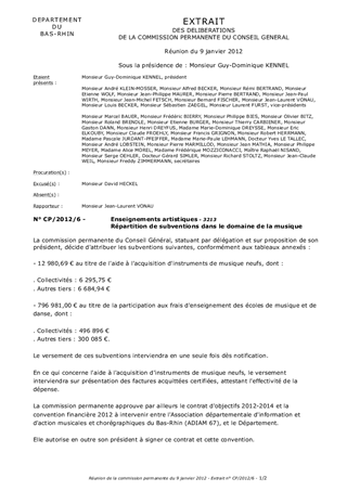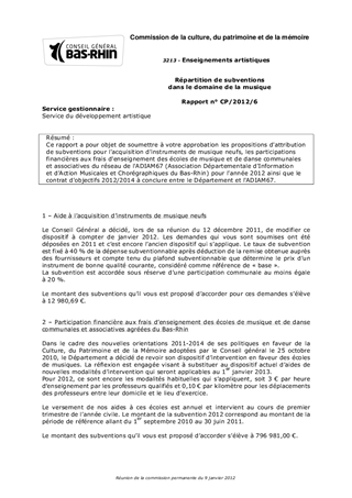 Ce rapport a pour objet de soumettre à votre approbation les propositions d'attribution de subventions pour l'acquisition d'instruments de musique neufs, les participations financières aux frais d'enseignement des écoles de musique et de danse communales et associatives du réseau de l'ADIAM67 (Association Départementale d'Information et d'Action Musicales et Chorégraphiques du Bas-Rhin) pour l'année 2012 ainsi que le contrat d'objectifs 2012/2014 à conclure entre le Département et l'ADIAM67.