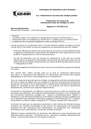 Le présent rapport vise à détailler le programme de travaux de maintenance à entreprendre dans les collèges pour lannée 2012. Le tableau joint en annexe précise la répartition des enveloppes budgétaires votées au Budget Primitif.