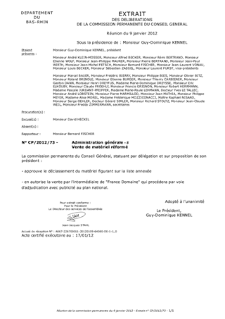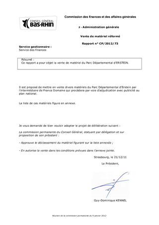 Vente de matériel réformé Resumé Ce rapport a pour objet la vente de matériel du Parc Départemental d'ERSTEIN. Pièces jointes Délibération Rapport Assemblée : Commission Permanente Date : 09/01/2012 Rapporteur : Monsieur Bernard FISCHER Collectivité : Conseil départemental du Bas-Rhin Direction : Direction des finances et de la commande publique Service : Service des finances Domaine : Non renseigné Commission : M - Commission des finances et des affaires générales