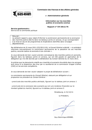 Le présent rapport a pour objet dinformer la commission permanente de la conclusion des marchés publics décrits dans les tableaux joints en annexe, et qui correspondent à la mise en uvre de programmes et dopérations identifiés dans le budget départemental.