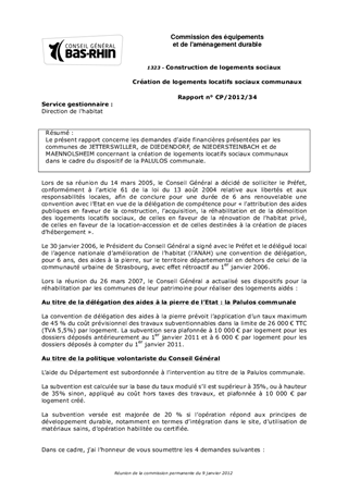 Le présent rapport concerne les demandes daide financières présentées par les communes de JETTERSWILLER, de DIEDENDORF, de NIEDERSTEINBACH et de MAENNOLSHEIM concernant la création de logements locatifs sociaux communaux dans le cadre du dispositif de la PALULOS communale.