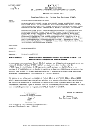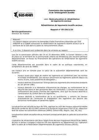 Le présent rapport concerne les demandes daide financières présentées par CUS HABITAT et la SIBAR concernant la réhabilitation de logements locatifs sociaux sur le territoire de la CUS dans le cadre du renouvellement urbain. A ce titre, 2 dossiers sont présentés dans les annexes au rapport.