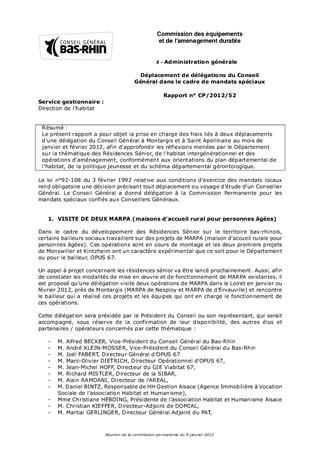 Le présent rapport a pour objet la prise en charge des frais liés à deux déplacements d'une délégation du Conseil Général à Montargis et à Saint Apollinaire au mois de janvier et février 2012, afin d'approfondir les réflexions menées par le Département sur la thématique des Résidences Sénior, de l'habitat intergénérationnel et des opérations d'aménagement, conformément aux orientations du plan départemental de l'habitat, de la politique jeunesse et du schéma départemental gérontologique.