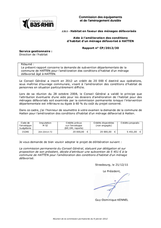 Le présent rapport concerne la demande de subvention départementale de la commune de HATTEN pour l'amélioration des conditions d'habitat d'un ménage défavorisé âgé à HATTEN.