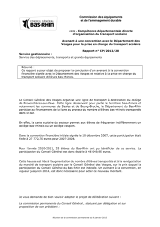 Ce rapport a pour objet de proposer la conclusion d'un avenant à la convention financière signée avec le Département des Vosges et relative à la prise en charge du transport scolaire d'élèves bas-rhinois.