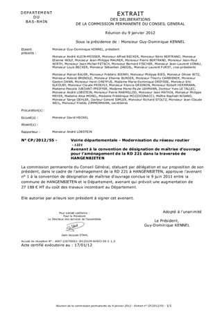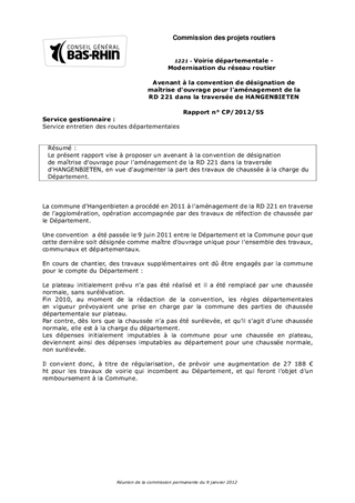 Le présent rapport vise à proposer un avenant à la convention de désignation de maîtrise douvrage pour laménagement de la RD 221 dans la traversée d'HANGENBIETEN, en vue d'augmenter la part des travaux de chaussée à la charge du Département.