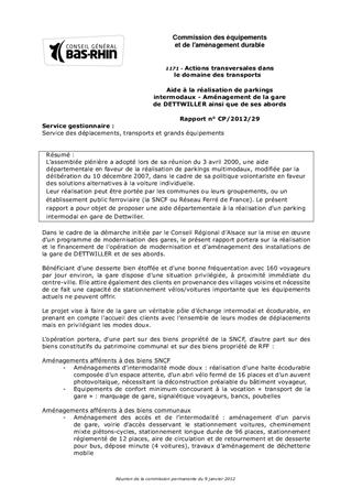 Lassemblée plénière a adopté lors de sa réunion du 3 avril 2000, une aide départementale en faveur de la réalisation de parkings multimodaux, modifiée par la délibération du 10 décembre 2007, dans le cadre de sa politique volontariste en faveur des solutions alternatives à la voiture individuelle. Leur réalisation peut être portée par les communes ou leurs groupements, ou un établissement public ferroviaire (la SNCF ou Réseau Ferré de France). Le présent rapport a pour objet de proposer une aide départementale à la réalisation d'un parking intermodal en gare de Dettwiller.
