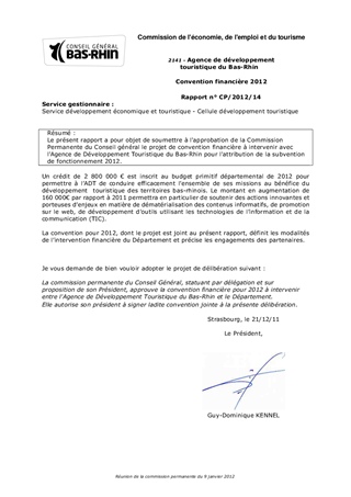 Le présent rapport a pour objet de soumettre à l'approbation de la Commission Permanente du Conseil général le projet de convention financière à intervenir avec l'Agence de Développement Touristique du Bas-Rhin pour l'attribution de la subvention de fonctionnement 2012.
