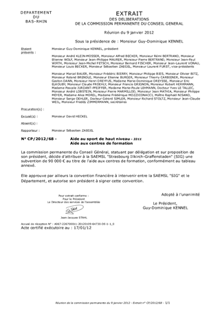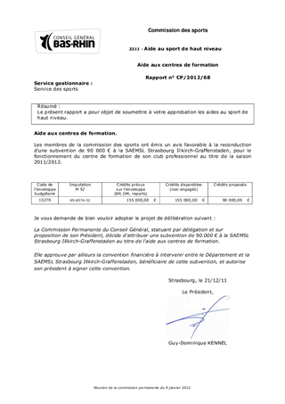 Aide aux centres de formation Resumé Le présent rapport a pour objet de soumettre à votre approbation les aides au sport de haut niveau. Pièces jointes Délibération Rapport Assemblée : Commission Permanente Date : 09/01/2012 Rapporteur : Monsieur Sébastien ZAEGEL Collectivité : Conseil départemental du Bas-Rhin Direction : Direction de la jeunesse et des sports Service : Service des sports Domaine : Non renseigné Commission : K - Commission des sports