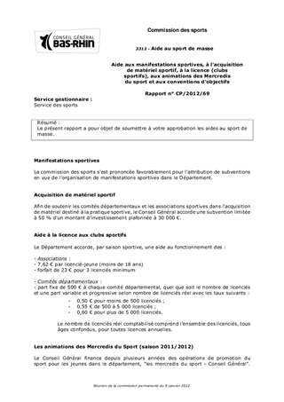 Le présent rapport a pour objet de soumettre à votre approbation les aides au sport de masse.