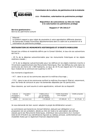 Le présent rapport a pour objet de soumettre à votre approbation différents dossiers de demandes daides financières départementales dans le cadre de la protection et la valorisation du patrimoine protégé.