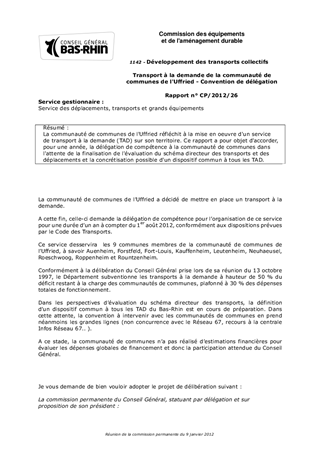 La communauté de communes de l'Uffried réfléchit à la mise en oeuvre d'un service de transport à la demande (TAD) sur son territoire. Ce rapport a pour objet d'accorder, pour une année, la délégation de compétence à la communauté de communes dans l'attente de la finalisation de l'évaluation du schéma directeur des transports et des déplacements et la concrétisation possible d'un dispositif commun à tous les TAD.