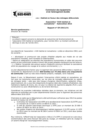 Le présent rapport concerne la demande de subvention de fonctionnement de l'association AVA habitat et nomadisme, pour l'année 2012. Le montant sollicité est identique à celui de l'année 2011.