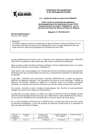 Le présent rapport concerne la demande du Pays de Saverne plaine et Plateau en vue du soutien technqiue et financier du Département pour le projet Médiaterre afin de lutter contre la précarité énergétique de locataires du parc HLM.