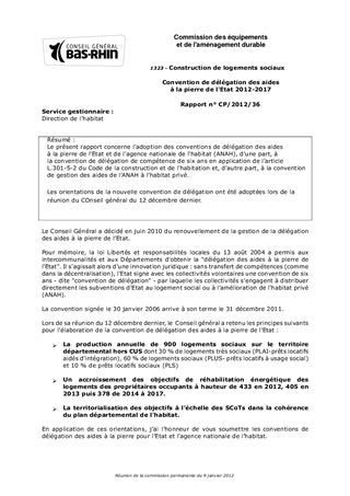 Le présent rapport concerne l'adoption des conventions de délégation des aides à la pierre de l'Etat et de l'agence nationale de l'habitat (ANAH), d'une part, à la convention de délégation de compétence de six ans en application de larticle L.301-5-2 du Code de la construction et de lhabitation et, d'autre part, à la convention de gestion des aides de lANAH à lhabitat privé. Les orientations de la nouvelle convention de délégation ont été adoptées lors de la réunion du COnseil général du 12 décembre dernier.