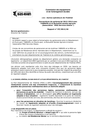 Le présent rapport a pour objet la formalisation du partenariat entre le Département et d'une part, l'ABRAPA, et d'autre part, la Mutualité Sociale Agricole à travers l'association MSA Services Alsace. L'enjeu de ces conventions de partenariat est de mobiliser l'ABRAPA et la MSA sur les projets de Résidences sénior réalisées dans le Département, notamment sur le volet 'définition du projet de vie' et accompagnement des séniors, conformément aux orientations du plan départemental de l'habitat et du schéma gérontologique.