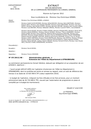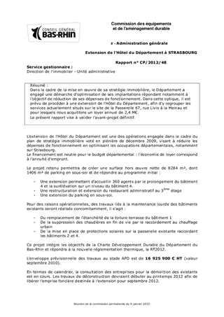 Dans le cadre de la mise en uvre de sa stratégie immobilière, le Département a engagé une démarche doptimisation de ses implantations répondant notamment à lobjectif de réduction de ses dépenses de fonctionnement. Dans cette optique, il est prévu de procéder à une extension de lHôtel du Département, afin dy regrouper les services actuellement situés sur le site de la Passerelle 67, rue Livio à la Meinau et pour lesquels nous acquittons un loyer annuel de 2,4 M€. Le présent rapport vise à valider lavant-projet définitif.