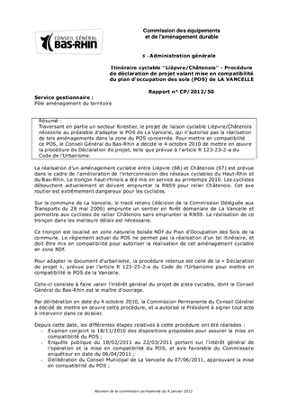 Traversant en partie un secteur forestier, le projet de liaison cyclable Lièpvre/Châtenois nécessite au préalable dadapter le POS de La Vancelle, qui nautorise pas la réalisation de tels aménagements dans la zone du POS concernée. Pour mettre en compatibilité ce POS, le Conseil Général du Bas-Rhin a décidé le 4 octobre 2010 de mettre en uvre la procédure de Déclaration de projet, telle que prévue à l'article R 123-23-2-a du Code de lUrbanisme.