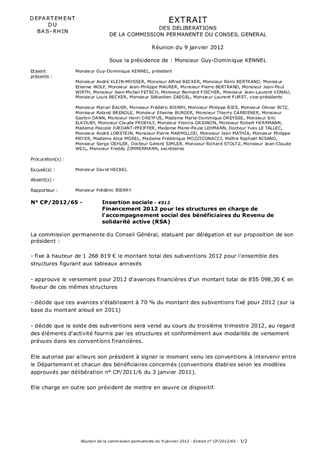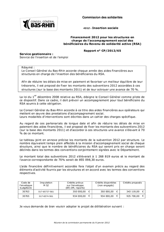 Le Conseil Général du Bas-Rhin accorde chaque année des aides financières aux structures en charge de l'insertion des bénéficiaires du RSA. Afin de réduire les délais de mise en paiement et favoriser un meilleur équilibre de leur trésorerie, il est proposé de fixer les montants des subventions 2012 accordées à ces structures (sur la base des montants 2011) et de leur octroyer une avance de 70 %.