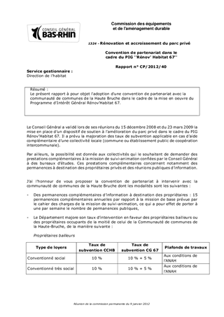 Le présent rapport à pour objet l'adoption d'une convention de partenariat avec la communauté de communes de la Haute Bruche dans le cadre de la mise en oeuvre du Programme d'Intérêt Général Rénov'Habitat 67.