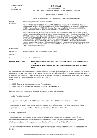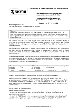 Ce rapport propose d'attribuer une subvention, au titre du programme 2012, à la fédération des producteurs de fruits du Bas-Rhin pour le maintien et le développement des vergers familiaux dans le cadre de sa convention pluriannuelle de partenariat avec notre collectivité.