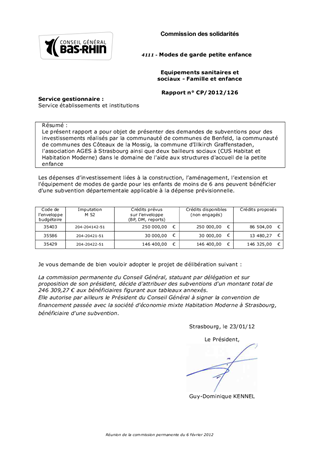 Le présent rapport a pour objet de présenter des demandes de subventions pour des investissements réalisés par la communauté de communes de Benfeld, la communauté de communes des Côteaux de la Mossig, la commune d'Illkirch Graffenstaden, l'association AGES à Strasbourg ainsi que deux bailleurs sociaux (CUS Habitat et Habitation Moderne) dans le domaine de l'aide aux structures d'accueil de la petite enfance