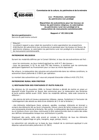 Le présent rapport a pour objet de soumettre à votre approbation les propositions d'attribution de subventions aux communes et paroisses pour les travaux en faveur du patrimoine religieux, la valorisation du patrimoine rural non protégé et la restauration de monuments commémoratifs.