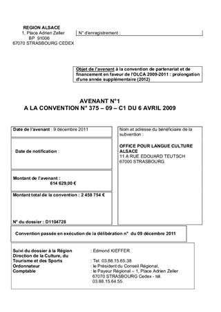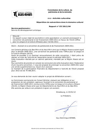 Ce rapport a pour objet de soumettre à votre approbation un avenant prolongeant la convention de partenariat et de financement 2009-2011 en faveur de l'OLCA (Office pour la Langue et la Culture d'Alsace) pour l'année 2012.