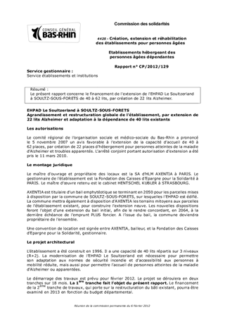 Le présent rapport concerne le financement de l'extension de l'EHPAD Le Soultzerland à SOULTZ-SOUS-FORETS de 40 à 62 lits, par création de 22 lits Alzheimer.