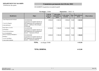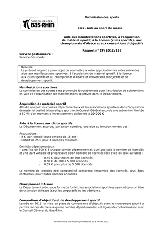 Le présent rapport a pour objet de soumettre à votre approbation les aides suivantes : aide aux manifestations sportives, à l'acquisition de matériel sportif, à la licence aux clubs sportifs et au championnat d'Alsace et conventions d'objectifs et de développement sportif.