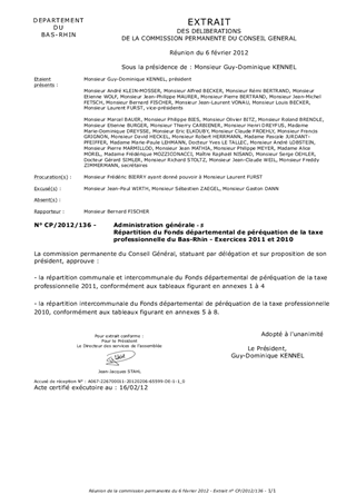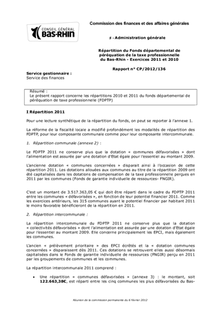 Répartition du Fonds départemental de péréquation de la taxe professionnelle du Bas-Rhin - Exercices 2011 et 2010 Resumé Le présent rapport concerne les répartitions 2010 et 2011 du fonds départemental de péréquation de taxe professionnelle (FDPTP) Pièces jointes Délibération Rapport Annexe 1 Annexe 2 Annexe 3 Annexe 4 Annexe 5 Annexe 6 Annexe 7 Annexe 8 Assemblée : Commission Permanente Date : 06/02/2012 Rapporteur : Monsieur Bernard FISCHER Collectivité : Conseil départemental du Bas-Rhin Direction : Direction des finances et de la commande publique Service : Service des finances Domaine : Non renseigné Commission : M - Commission des finances et des affaires générales