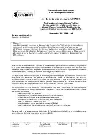 Le présent rapport concerne la demande de l'association 'AVA habitat et nomadisme' concernant le cofinancement d'une action d'assistance à maîtrise d'ouvrage au bénéfice de ménages réalisant des travaux suite à leur inscription dans le dispositif départemental d'éradication du logement insalubre ou non décent que le Département gère dans le cadre du plan départemental d'action pour le logement des personnes défavorisées.