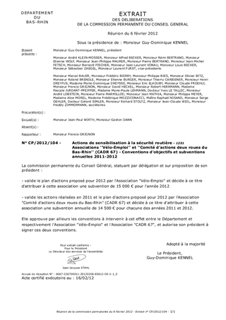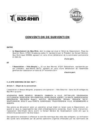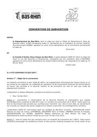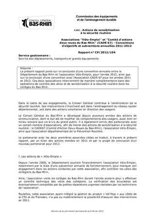 Le présent rapport porte sur la conclusion d'une convention annuelle entre le Département du Bas-Rhin et l'association Vélo-Emploi, pour l'année 2012, ainsi que sur la conclusion d'une convention avec l'Association CADR 67 pour les années 2011 et 2012. Ces deux associations interviennent de manière complémentaire dans des opérations de contrôle des vélos et de sensibilisation à la sécurité routière dans les collèges du Bas-Rhin.