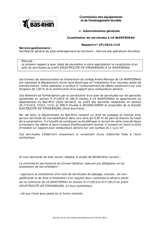Le présent rapport a pour objet de soumettre à votre approbation la constitution d'un acte de servitudes au profit d'ELECTRICITE DE STRASBOURG à LA WANTZENAU.