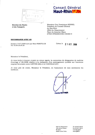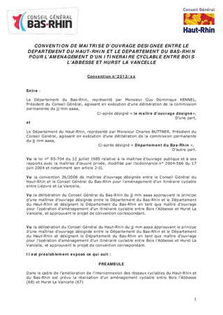 Le Plan Vélo prévoit l'aménagement de liaisons cyclables structurantes pour mailler le réseau départemental et assurer les connexions avec les territoires limitrophes. Concernant plus particulièrement l'organisation, la conduite, le suivi et le financement du projet de la liaison entre Sélestat et Ste Marie aux Mines (section Bois l'Abbesse - Hurst) il est nécessaire de mettre en place une convention de maîtrise d'ouvrage désignée avec le Département du Haut-Rhin. Concernant l'itinéraire Lièpvre - Bois l'Abbesse réalisé en 2009-2010 il est nécessaire de modifier les modalités d'entretien de la passerelle sur la Lièpvrette (convention n°26-2008) pour intégrer une répartition des interventions entre les deux Départements. Dans le cadre du programme de modernisation du réseau routier, les modalités d'aménagements d'opérations de sécurité sont sujettes à partenariat local (participation financière) au titre des voies communales interceptées. Le présent rapport à pour objet de soumettre à votre approbation les conditions de réalisation et de gestion de la liaison cyclable Bois l'Abbesse - Hurst, du carrefour RD 425 - RD 62 près de Mittelbergheim et autoriser le Président à signer les conventions y afférent.