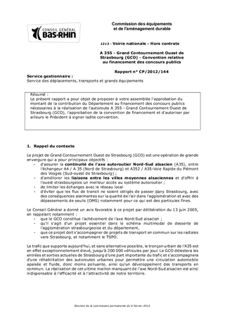 Le présent rapport a pour objet de proposer à votre assemblée l'approbation du montant de la contribution du Département au financement des concours publics nécessaires à la réalisation de l'autoroute A 355 - Grand Contournement Ouest de Strasbourg (GCO), l'approbation de la convention de financement et d'autoriser par ailleurs le Président à signer ladite convention.