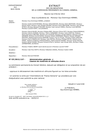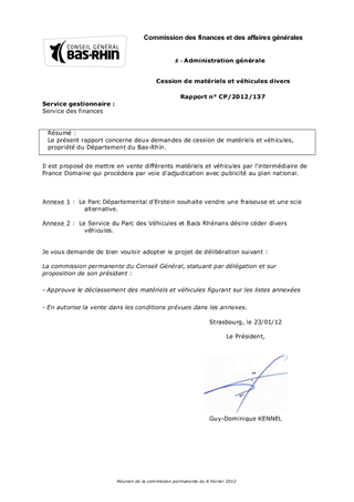 Le présent rapport concerne deux demandes de cession de matériels et véhicules, propriété du Département du Bas-Rhin.