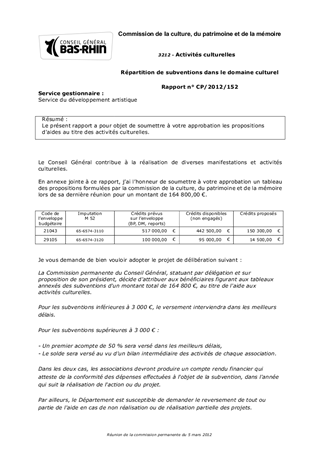 Le présent rapport a pour objet de soumettre à votre approbation les propositions d'aides au titre des activités culturelles.