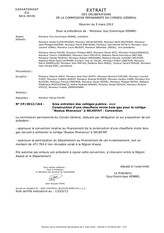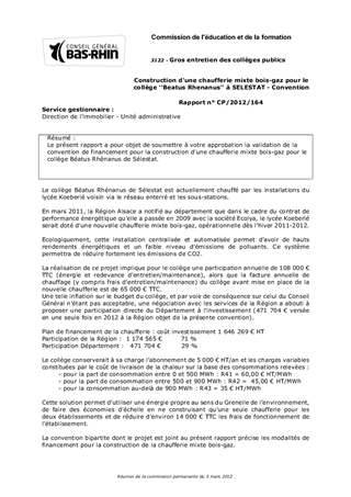Le présent rapport a pour objet de soumettre à votre approbation la validation de la convention de financement pour la construction d'une chaufferie mixte bois-gaz pour le collège Béatus Rhénanus de Sélestat.