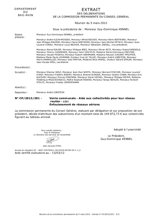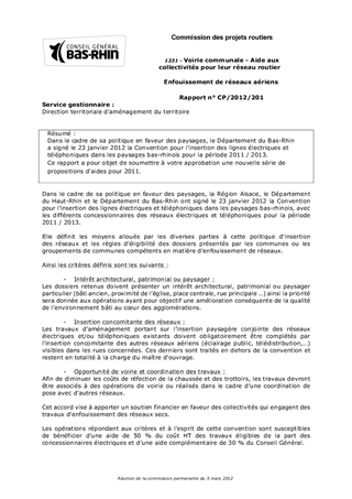 Dans le cadre de sa politique en faveur des paysages, le Département du Bas-Rhin a signé le 23 janvier 2012 la Convention pour l'insertion des lignes électriques et téléphoniques dans les paysages bas-rhinois pour la période 2011 / 2013. Ce rapport a pour objet de soumettre à votre approbation une nouvelle série de propositions d'aides pour 2011.