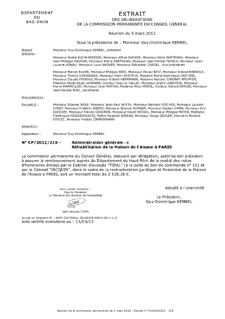 Le présent rapport a pour objet d'autoriser le président du Conseil Général à assurer le remboursement auprès du département du Haut-Rhin de la moitié des notes d'honoraires du cabinet d'avocats FIDAL et du cabinet JACQUIN, dans le cadre de la restructuration juridique et financière de la Maison de l'Alsace à Paris.
