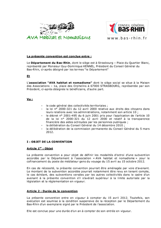 Le présent rapport concerne la reconduction du financement avec l'Etat, co responsable du schéma départemental d'accueil des gens du voyage avec le Département, d'une mission de médiation sociale en faveur des grands groupes de voyageurs. Cette intervention avait été menée en 2010 et 2011 avec un succès certain et AVA habitat et nomadisme sollicite le Département pour son renouvellement pendant 6 mois, du 15 avril au 15 octobre 2012.